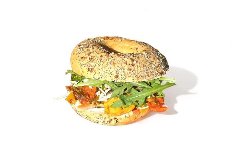Vegan en biologische bagel met gegrilde groenten zoals courgette en paprika, tomatensalsa, vegan mozzarella, een vegan kruidenspread & geroosterde pompoenpitten.