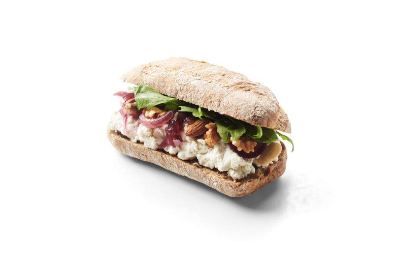 Donkere ciabatta met zachte geitenkaas, gekonfijte rode ui, zontomaatjes, gemengde noten & rucola