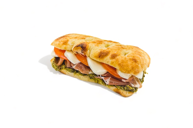 Schiacciata mozzarella met verse pesto, tomaat, balsamico, Prosciutto di Parma & rucola