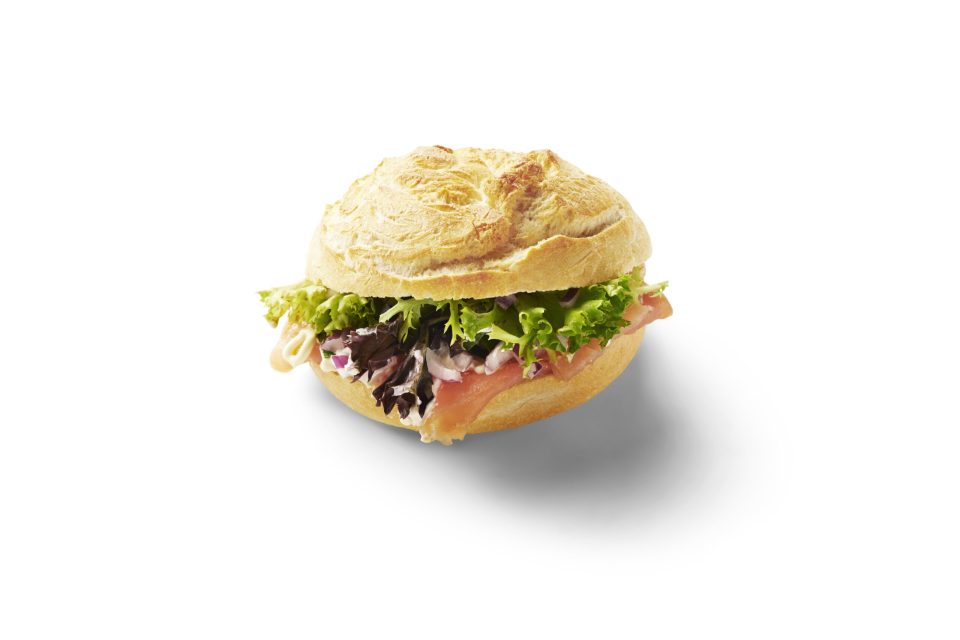 Witte bol met gerookte zalm, limoenmayonaise, bosui, rode ui & gemengde sla