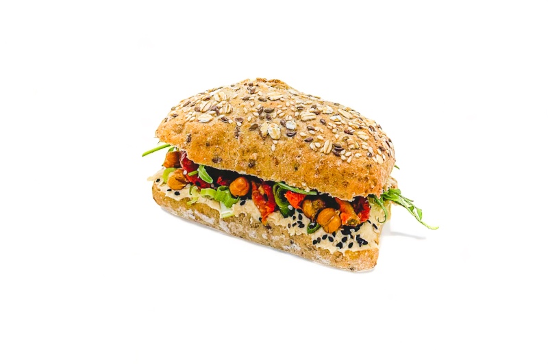 Meergranen ciabatta met hummus, tahin, sesamzaad, bosui & zontomaatjes