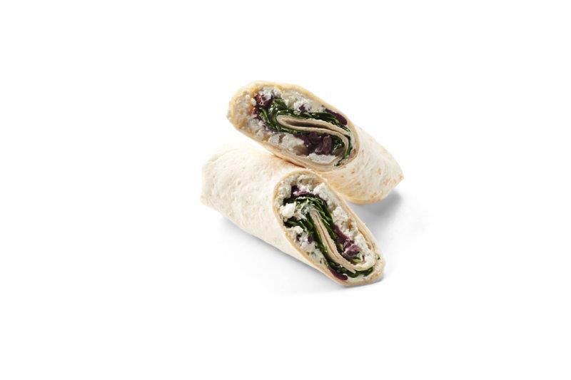 Tortilla wrap met zachte geitenkaas/gekonfijte rode ui/zontomaatjes/noten & rucola